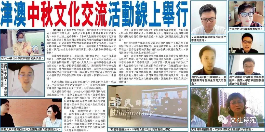 天津博物館副館長、李叔同紀念館館長沈岩,369合夥小鎮創始人、澳門國際青年智庫主席馮文滔,天津民俗研究專家、天津天後宮前館長尚潔,澳門城市大學人文社會科學學院教授、副院長王忠,南開大學哲學院副教授趙文,澳門國際青年智庫執行主席張瑜,澳門國際青年智庫理事長徐浩,天津李叔同紀念館張舸等專家學者出席了本次活動,與南開大學哲學院以及澳門369合夥小鎮的眾多青年學生齊聚雲端,暢談津、澳兩地的中秋文化習俗。